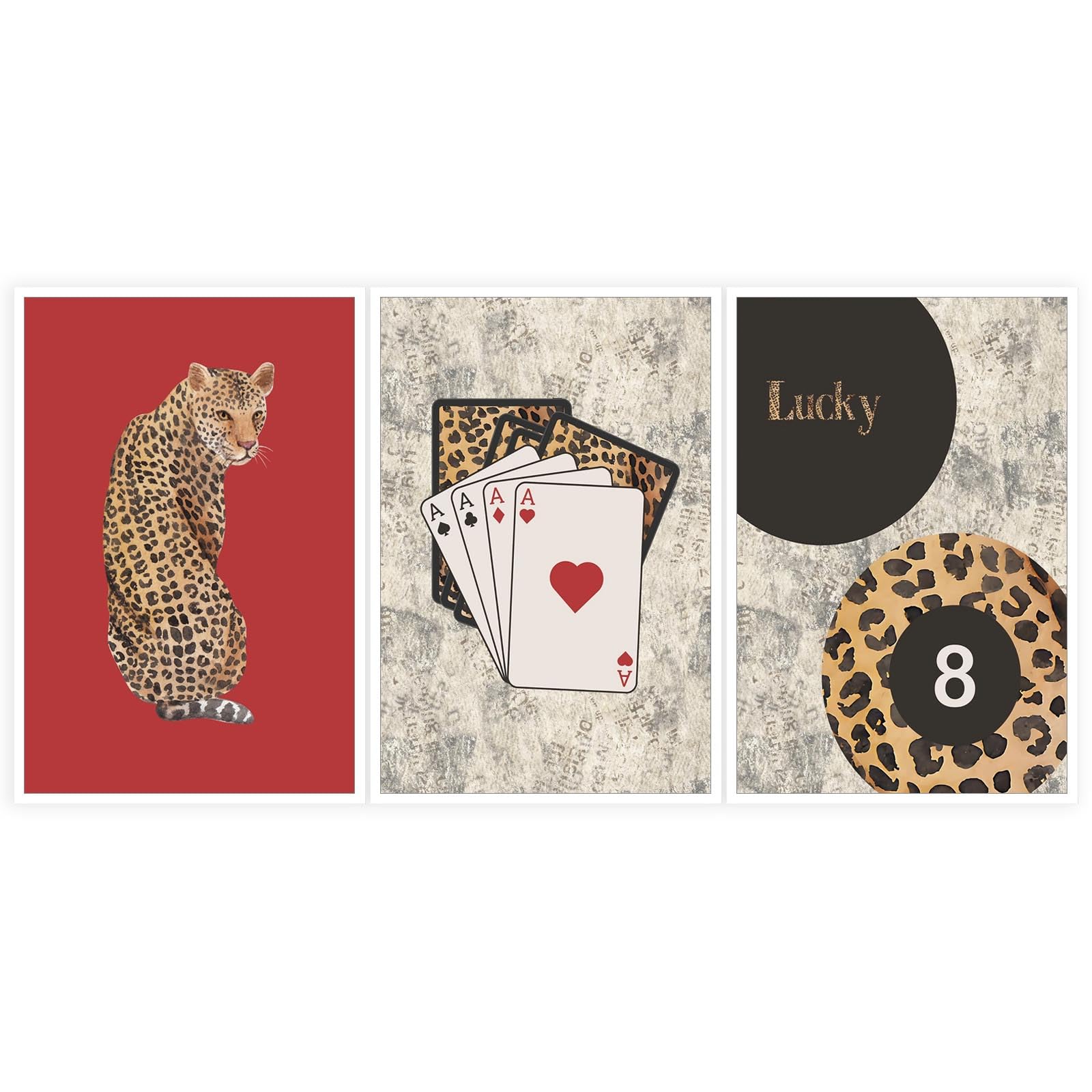 * Unique Design: The set features three prints, including Lucky 8 Ball playing cards and red leopard designs, offering a distinctive aesthetic that can add personality to a room. This uniqueness can spark conversations and create a memorable impression.