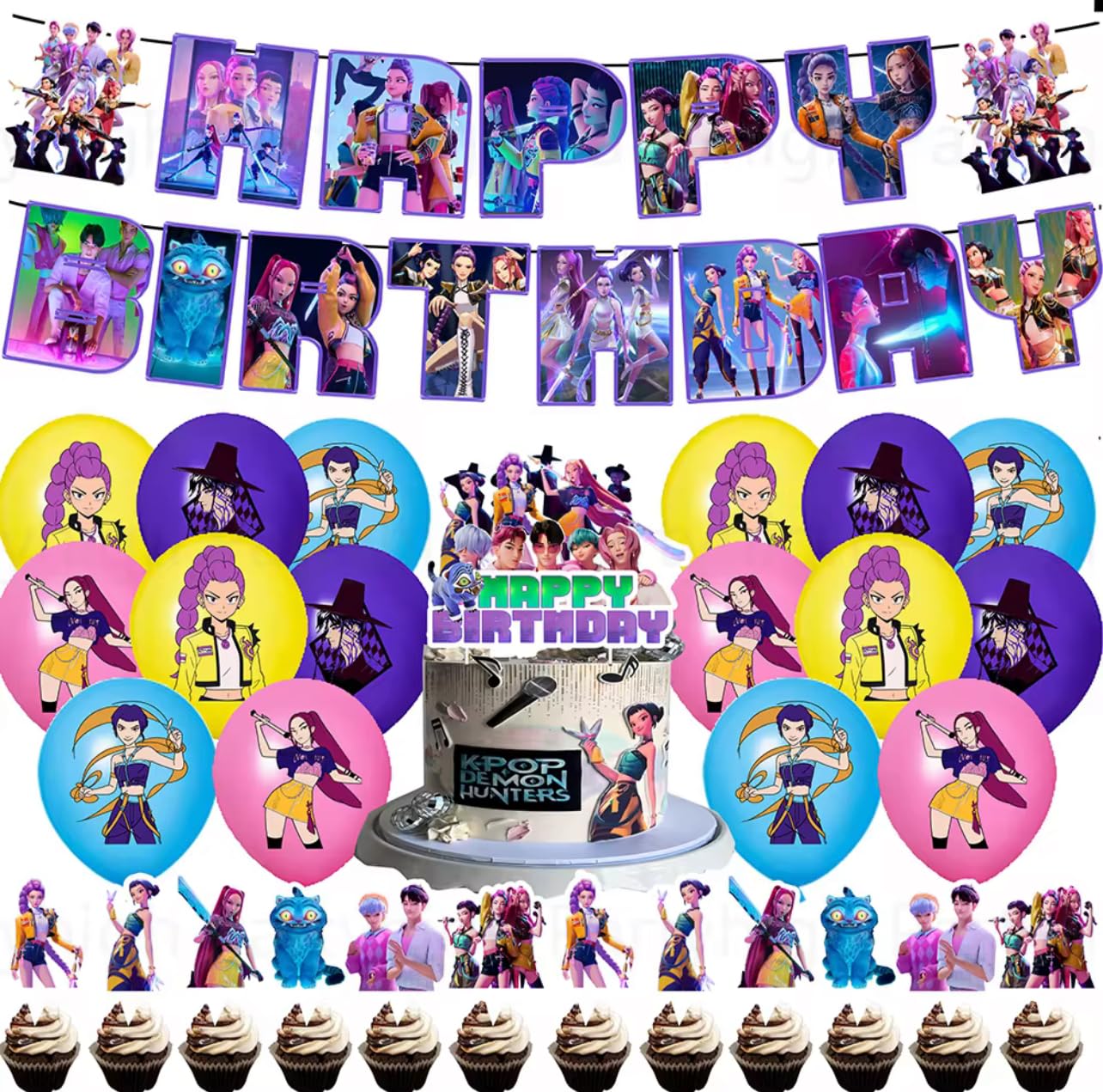 Cost [Take A Look] Popular ⋮ —K Pop Demon Hunters Birthday Decorations, Happy Birthday Banner, 16 Balloons, 12 Cake Toppers, A Cake Topper, K Pop Demon ....
