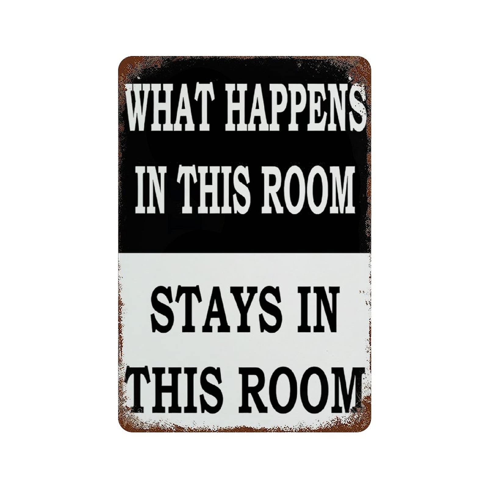 Made of metal with a retro tin design • — Funny Man Cave Sign What Happens in This Room Stays in This Room Retro Tin Sign Vintage Metal Sign for Home Office Wall Decor Shop Mural Bathroom — $2.00See this product.