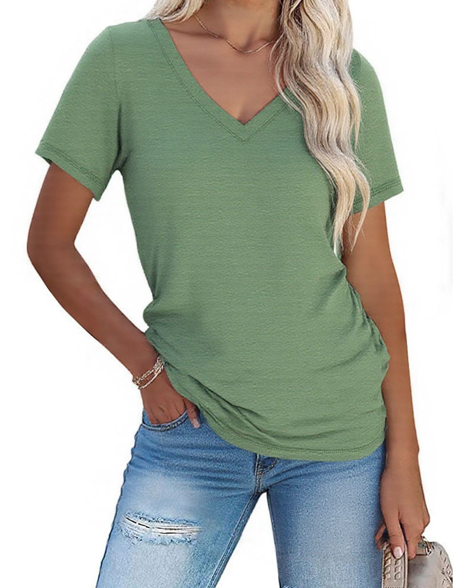 It just exists in the closet until the moment the sun comes out. — T Shirts Short Sleeve V Neck Tees Tops for Women Loose Casual Clothes Green — $2.77Get this here.