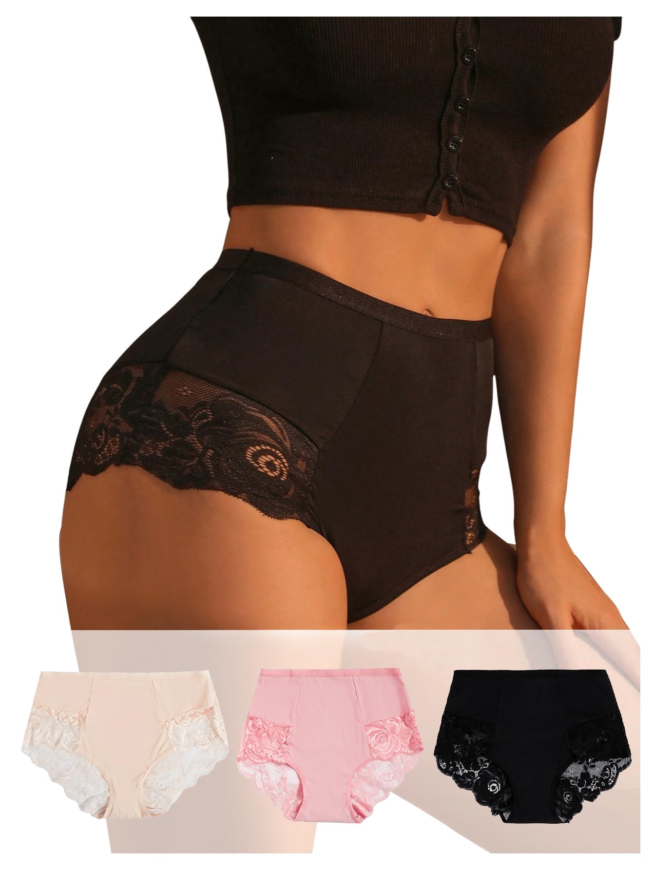 Haul At $1.55—Women's 3 Packs Lace Trim Underwear High Waist Briefs Underwear Comfy Soft Panties Black Apricot Pink Small.